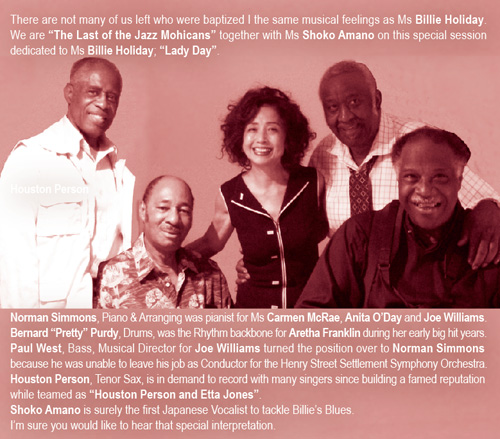ビリー・ホリデイのフィーリングの洗礼を受けたミュージシャンは、今や、殆どいなくなり、ショウコも含めて、我々は"最後のモヒカン族"という事になる。 今回のレコーディングのメンバーは、カーメン・マックレイ、ベティ・カーター、アニタ・オデイ、ジョー・ウィリアムスなどジャズ・シンガーのレコーディング及びコンサートで世界中を共に回って演奏し、ピアニスト・アレンジャーをつとめてきた、小生、ノーマン・シモンズがアレンジメントとピアノを担当している。